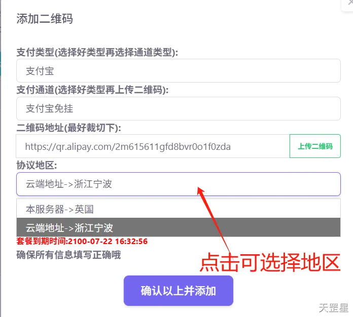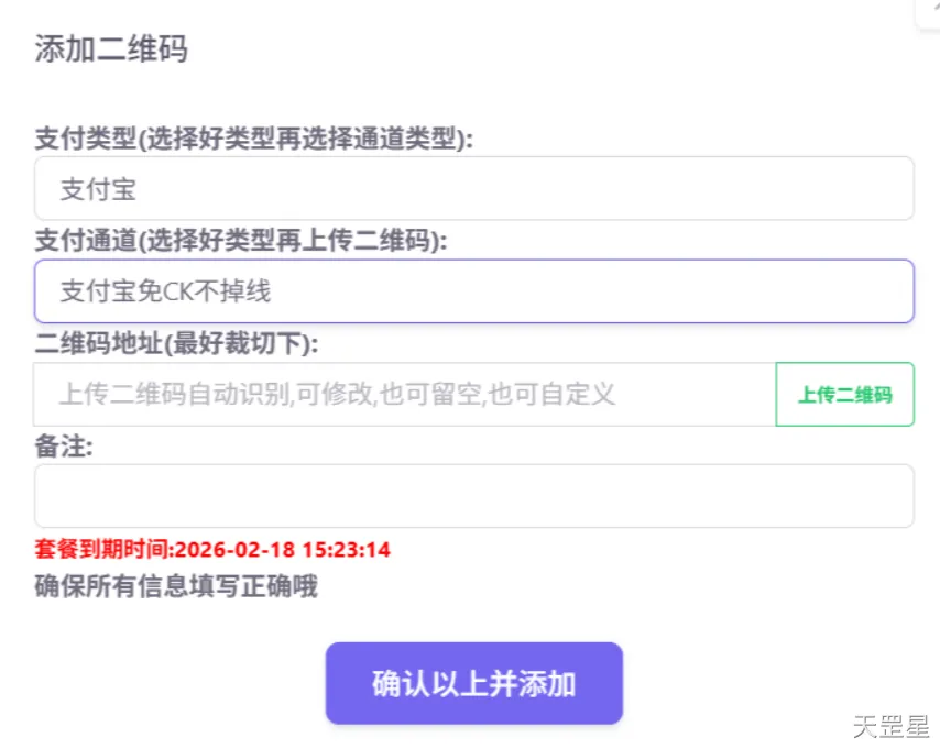 Ps:如果不上传二维码,二维码地址是空的,上传后确认二维码链接确认信息正确,点击确认添加