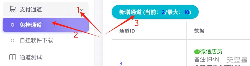 点击支付通道->免挂通道->新增通道