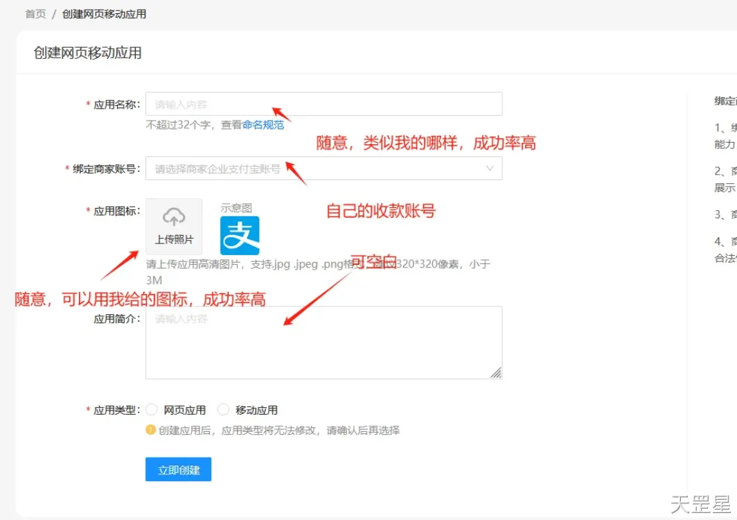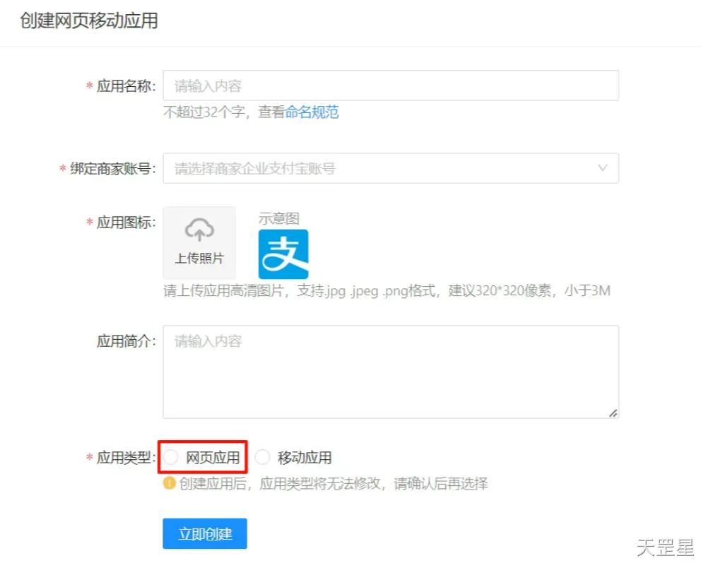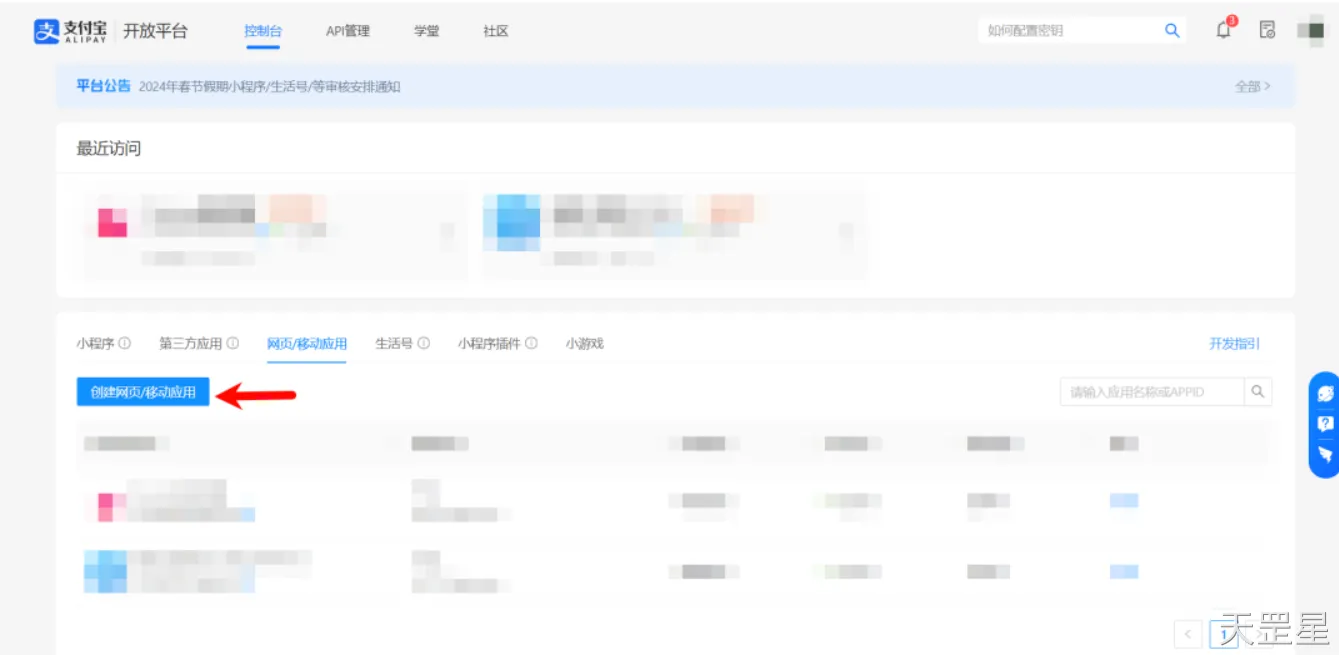 然后进入你的控制台,选择网页/移动应用,点击创建网页/移动应用,在创建页面选择网页应用。