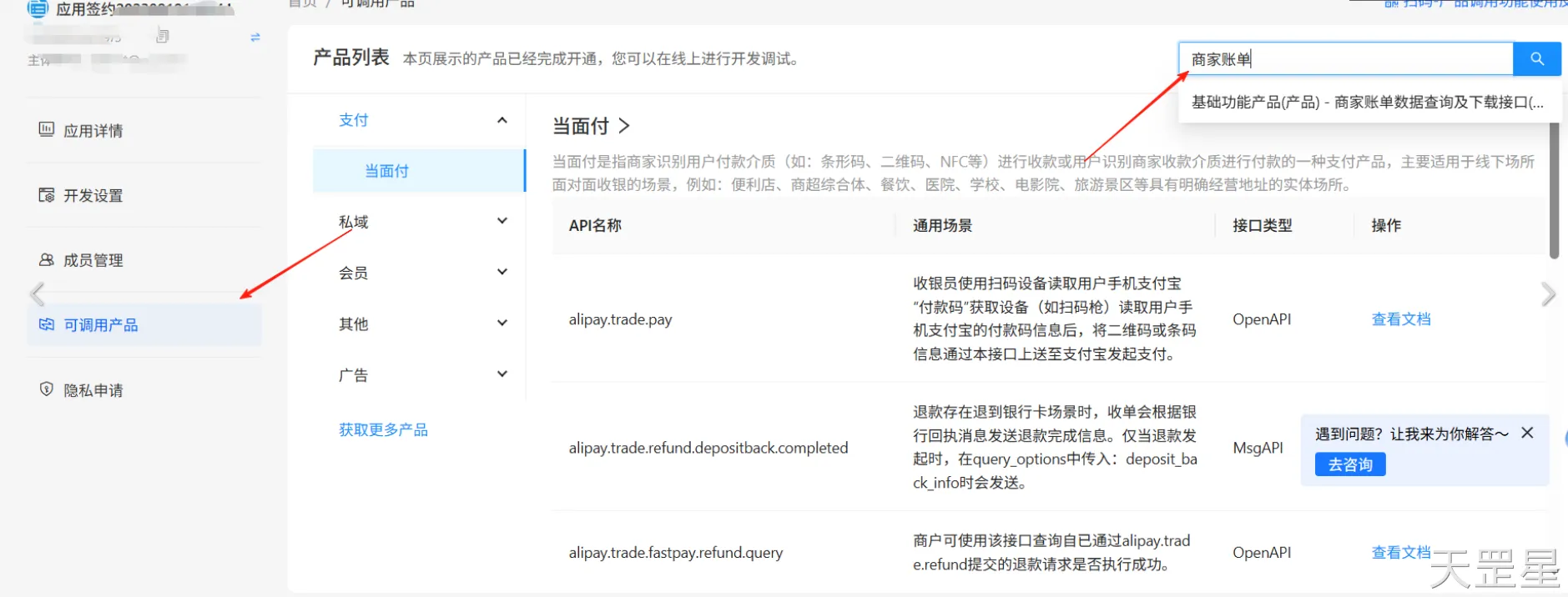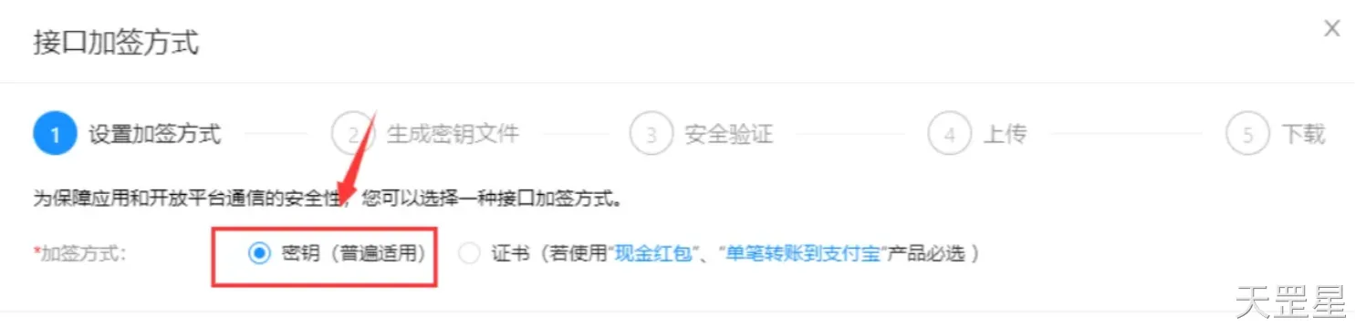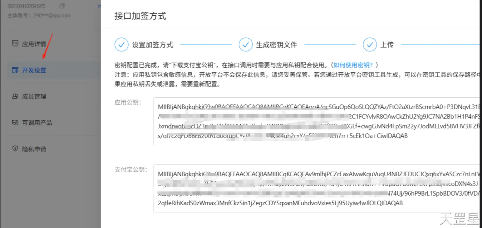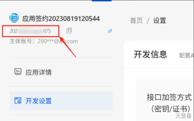 进入详情后点击开发设置,选择接口加签方式(密钥/证书)